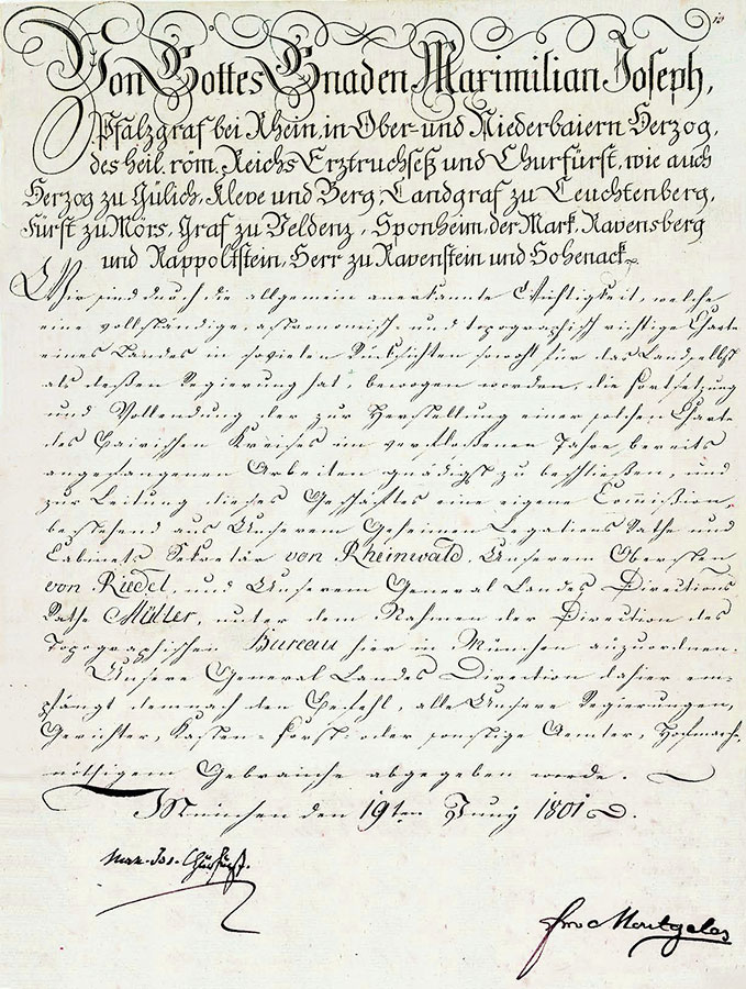 Der 19. Juni 1801 gilt als Gründungsdatum der Bayerischen Vermessungsverwaltung. An diesem Tag unterzeichnete Kurfürst Max IV. Joseph in München die Gründungsurkunde für das Topographische Bureau. Mit diesem „höchsten Rescript“ gab er den Auftrag, erstmals eine „vollständige, astronomisch- und topographisch richtige Charte“ des Kurfürstentums Bayern im Maßstab 1:50 000 für militärische und zivile Zwecke zu erarbeiten. Zur Leitung dieses „Geschäfts“ bestimmte der Kurfürst den Geheimen Legationsrat und Kabinettssekretär von Rheinwald, Oberst von Riedl und den General-Landesdirektionsrat Müller. In der umfangreichen Urkunde wurde u.a. festgelegt, dass sämtlichen „über Land gehenden“ Ingenieuren überall Unterkunft und Verpflegung zu verschaffen ist, dass sie mit ortskundigen „Boten“ zu versehen sind und dass ihnen alle „Thürme“, „Schlößer“ und sonstigen „Lokale“ zu öffnen sind. Ferner wurde in der Urkunde festgelegt, dass alle Landesarchive, Gerichts- und Stadtregistraturen der Direktion des Topographischen Bureaus auf Verlangen ihre aufbewahrten Pläne gegen eine auszustellende Versicherung der Rückgabe abzuliefern hatten. Als monatliches Budget wurde eine Summe von 5700 f. (Floren oder Gulden; nach heutigem Stand wäre 1 Gulden ca. 10 Euro wert) festgelegt. Die erste Tätigkeit des Topographischen Bureaus war die Messung der Basislinie zwischen Unterföhring und Aufkirchen.